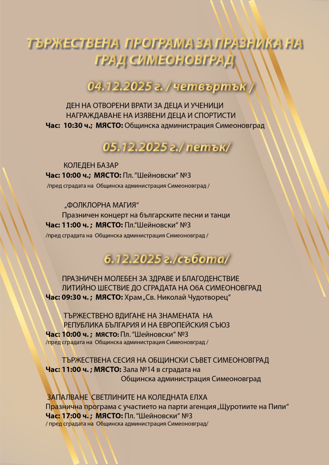 С радост ви каним да бъдете част от тържествата по повод Празника на град Симеоновград, които тази година ще се проведат в три последователни дни – от 4 до 6 декември.